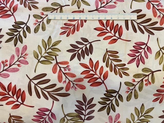 Dette flotte stof har et lys bundfarve med grene i grønne og rosa/lyserøde farver.
