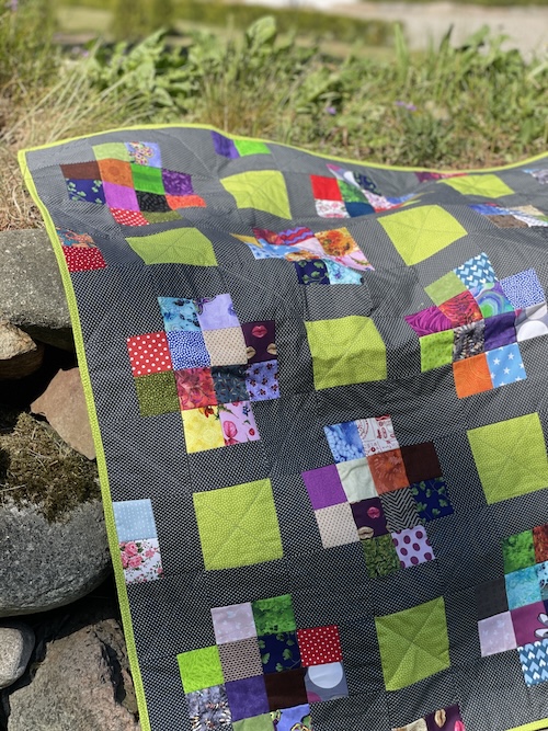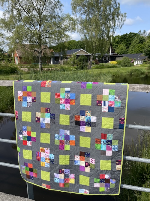Har quiltet diagonalt med en meleret quiltetråd igennem alle de grønne blokke.