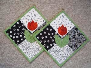 Grydelapper Med Tulipaner - 1024 er et patchworkmønster, som indeholder papskabeloner til et pat grydelapper, lige klar til at klippe ud.
