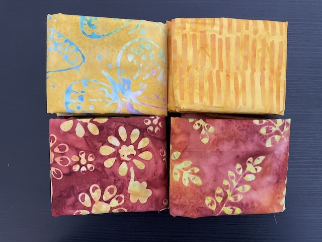Disse 4 batikstoffer som er pakke sammen har en gul med striber, en gul med blomster, en brændt orange med blade ranke og en brændt orange med blomster. Disse stoffer er nemme at arbejde med og er ideelle til patchwork.