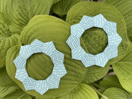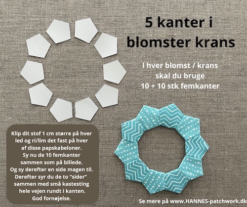 Forside » Gratis DIY og Inspiration » Nybegynder patchwork » Håndsyet blomster - nemme at sy. » Håndsyet blomster krans med 5 kanter. Håndsyet blomster krans med 5 kanter. Vi har nemlig lavet et gratis mønster og vejledning til de fineste håndsyede patchwork-blomster, ja måske mere blomster krans, Du kan bruge blomsterne som pynt i vinduer, på tasker, som bordpynt eller måske som en sød værtindegave. Det eneste du skal bruge er: ✂️ Små stykker patchworkstof (rester er perfekte!) 🧵 Nåle, tråd og lidt pap 🪡 Og lysten til at fordybe dig i noget hyggeligt Disse flotte blomster/kranse består at 2 x 10 papskabeloner i femkanter syet sammen som en krans. Kan også købes færdig udstandset her ![]() Her det helt lige meget hvilken størrelse dine femkanter har - bare de er lige store. Beklæd dine papskabeloner med stof som du enten syr eller rier fast om pappet. Husk ca en cm sømrum på alle sider. Har du lyst til at komme en tynd volumenvlies imellem pap og stof er det også en mulighed, så bliver blomster "lidt mere fyldig". Dette vat skal være helt samme størrelse som dine papskabeloner. Sy derefter to side af blomsten/kransen og sy dem sammen tilsidst med små usynlige sting. Tag derefter evt ritråden ud - men pappet skal jo blive i da det er det som holder faconen. Alle min femkanter har et sidemål her på 3 cm. Men du kan jo lave dem i den størrelse du har dine papskabeloner i. Og måske i flere størrelser i et stort vindue. Og til at give som en smuk værtinde gave eller i steden for en "rigtig" blomst. Læs mere om geometriske figurer og deres fordele Lav smukke blomster med forskellige geometriske former Har du lyst til at sy andre blomster finder du nogle her: Blomster af 6 kanter Blomster af 8 kanter Blomster af "Lucy Boston" Rigtig god fornøjelse med at sy disse blomster-kranse af 5 kanter |