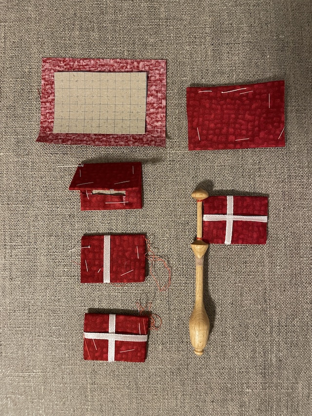 De små flag er syet over pap i hånden og derefter syet fast på kniple pinden.