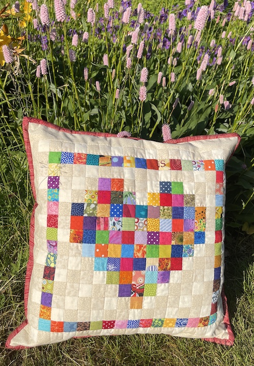 Den håndsyet og håndquiltet pude måler 40 x 40 cm.