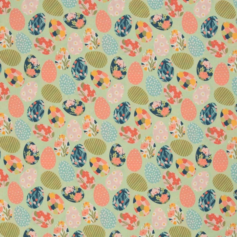 Dette meget smukke sart grønne bomuldsstof har flot bundfarve med masser af forskellige farver æg i alle retninger.