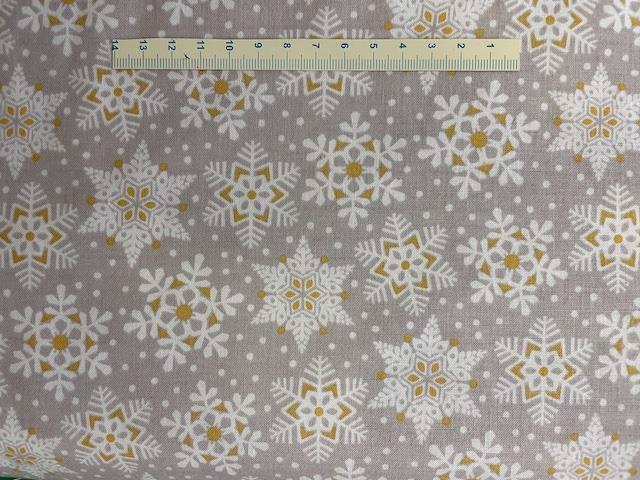 og har store uens hvide iskrystaller med hvide snefnug og guld prikker.