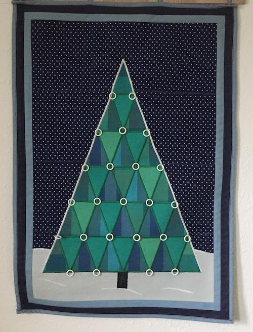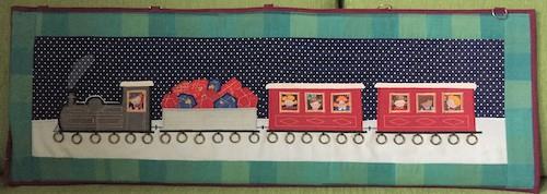 Julekalenderen med tog er syet til mit barnebarn i 1997, og den med juletræ til min mor i 1998.