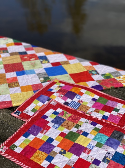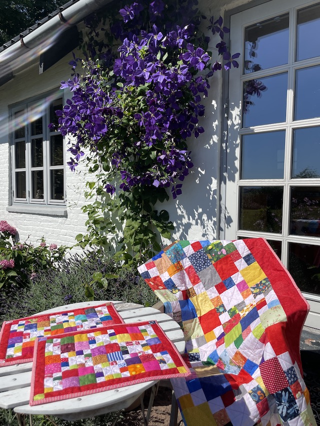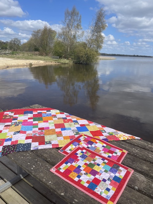 Forside » Gratis DIY og Inspiration » Patchworktæpper med danske bynavne 🇩🇰 » Dækkeservietter mm i stofrester efter bynavne tæpper » Juelsminde tæppet syet som dækkeservietter
