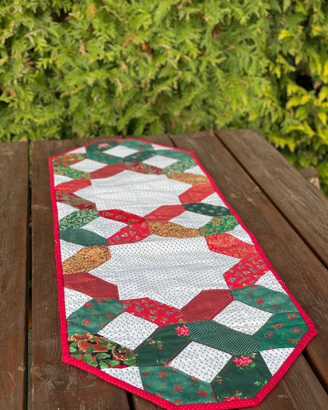 Forside » Gratis DIY og Inspiration » Patchworktæpper med danske bynavne 🇩🇰 » Juleting syet af julestoffer » Jule løber syet efter Langeskov tæppet