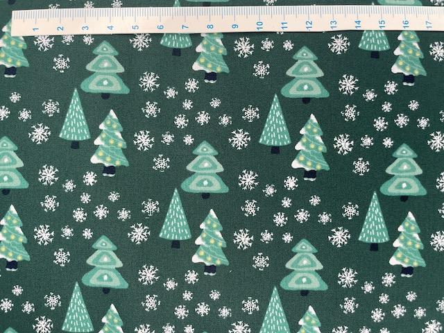 Er et flot grøn bred bomuldsstof med flotte grønne juletræer og hvide snefnug.