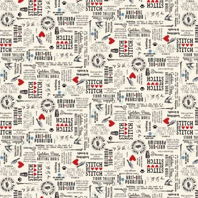 Knit1, purr2 patchworkstof - Tekst, er et meget smukt 100% bomuld patchwork stof der er 110 cm bred.