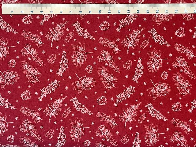 Er et flot rød bred bomuldsstof med flotte hvide grene og kogler