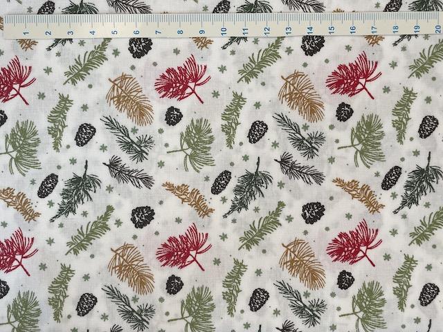 Er et flot hvid bred bomuldsstof med flotte grønne og røde grene og kogler