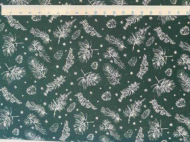 Er et flot grøn bred bomuldsstof med flotte hvide grene og kogler