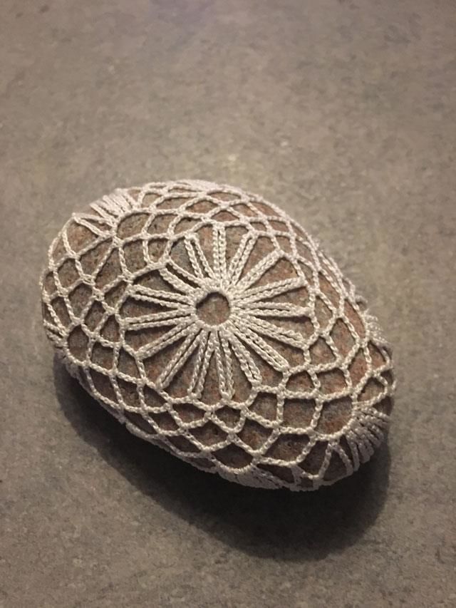 Sy den nu rundt i hele kanten af flakone, og stram den rundt om stene.