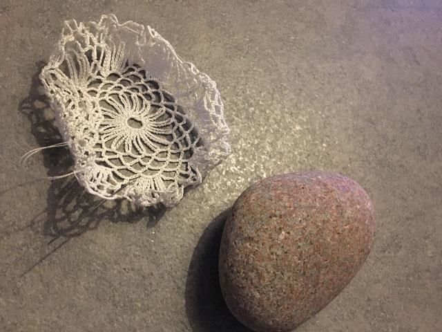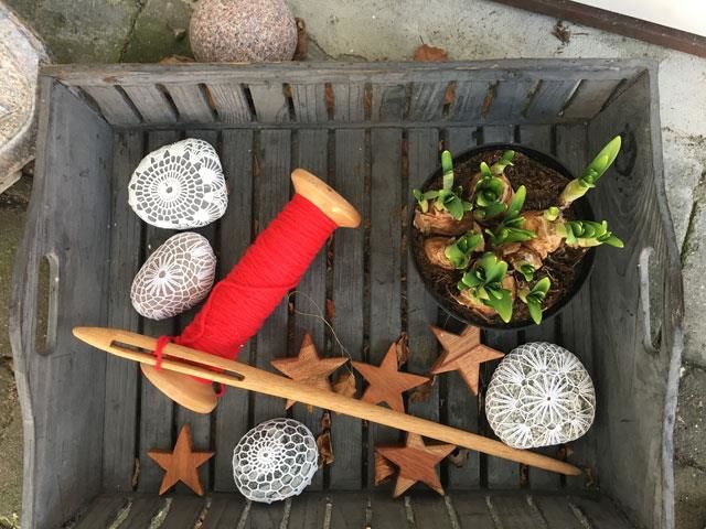 Lige nu har jeg mine sten i en bakke foran min lille patchwork butik, sammen med en nål og spole som min dejlig far har drejet i træ til mig.