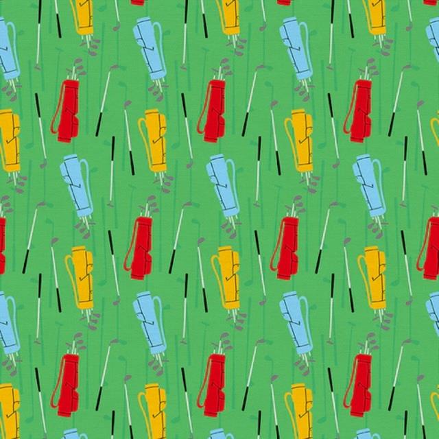 Dette meget flotte grønne patchwork stof har masser af golfsbags og golfkøller.