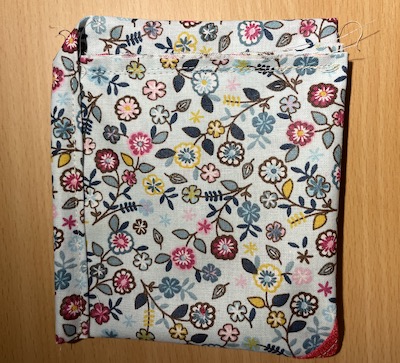 Her er den ene side færdig og viser hvordan du bukker hjørnet ind så du kan sy den anden side færdig.