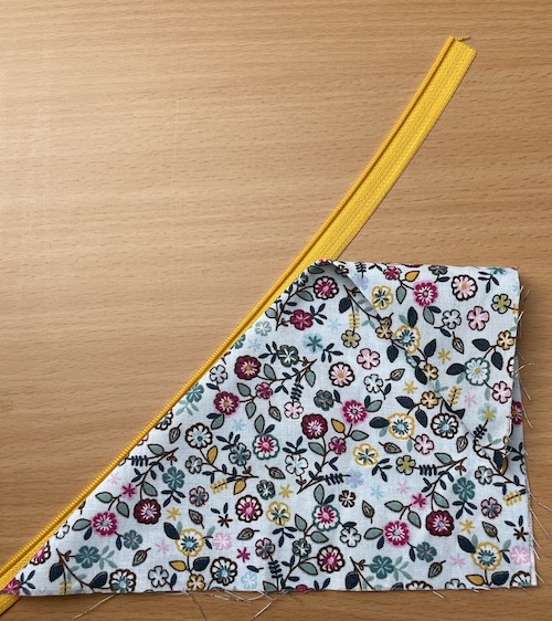 Sy nu din 1/2 lynlås ( med retsiden mod stoffet) på lige bagved folden, du har lavet diagonalt.
