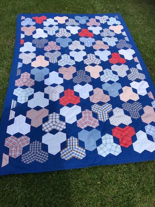 Astrid Skriver: Blå tæppe er af skjorter. Tæppet er syet på amerikansk og håndquiltet