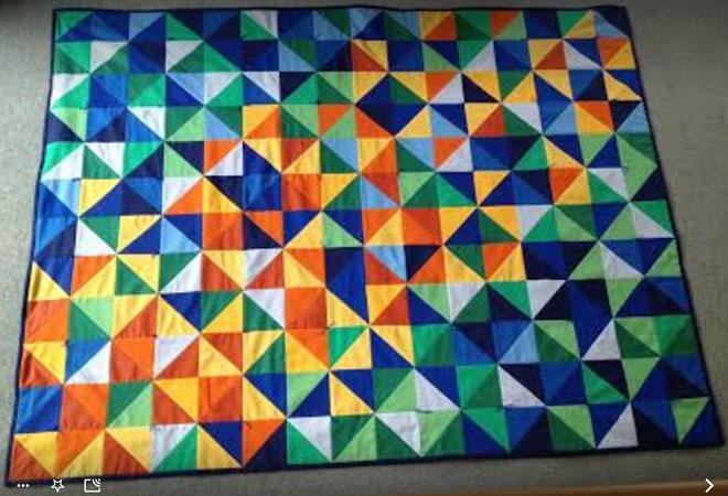 Lod 118:  Her kommer Gittes udgave af Sommerens Sjoveste Stofreste Sysler 2020    Gitte skriver:  Dette tæppe er syet og quiltet i hånden med japansk foldeteknik. Pynter på en bænk i vores entre.   Dette reste-sengetæppe har jeg syet på maskine til mit barnebarn. Det er knudequiltet.   Dette hyggetæppe med vlies-bagside har jeg syet til min dejlige barndomsveninde da hun blev 70. Det er maskisyet og knudeguiltet.