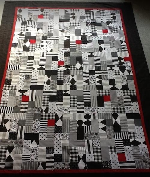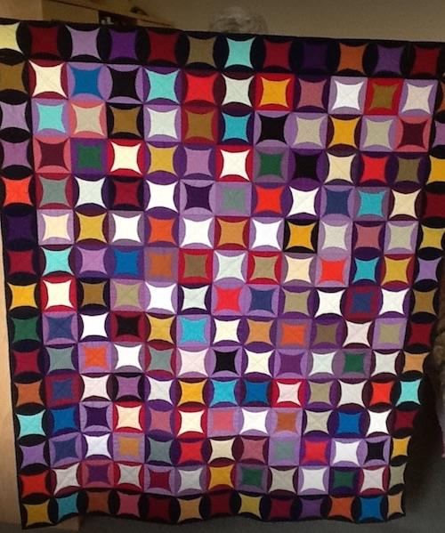 Dette hyggetæppe med vlies-bagside har jeg syet til min dejlige barndomsveninde da hun blev 70. Det er maskisyet og knudeguiltet.