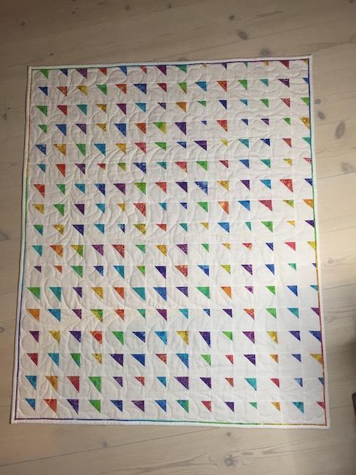 Dette er resterne fra en Circle of Geese jeg lavede som paper piecing. Der blev mange trekanter tilbage i forskellige størrelser.  Det er 1mX1,20m og kantet med en flange (jeg ved ikke hvad den hedder på dansk 😬🤔🤓🤣)