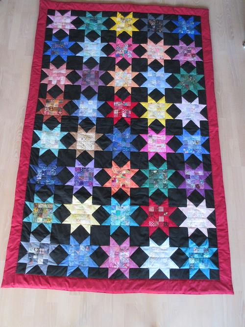 Små rester til stjernetæppet samlet gennem ca. 20 år, og drengetæppet er syet af skjorter, samt enkelte ikke skjorter. Passer til en enkelt seng og er syet i hånden
