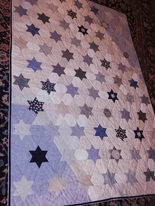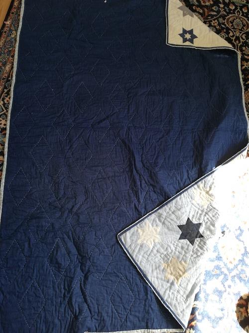 Mit tæppe er syet af rester fra aflagte skjorter og blå og hvide bomulds reststoffer,