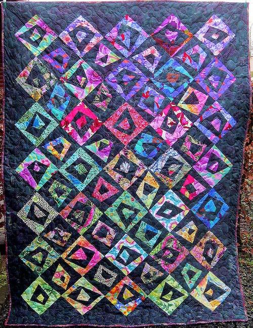”Ditzy Donuts” er syet til” Uldfeén” – min garnpusher Anne Mønster, som farver de skønneste garner i uld og silke! Tæppet er maskinsyet med mange forskellige rester i batikker og Kaffe Fassett stoffer og maskinquiltet. Mål: 135 x 180 cm.