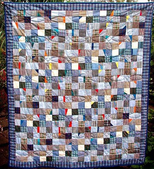 ”Villys tæppe” er en barselgave til min nieces søn. Håndsyet på amerikansk af genbrugs skjorter og kulørte lapper, mønster: Kaffe Fassett. Bomuldsfor. Håndquiltet. Mål: 115 x 135 cm.
