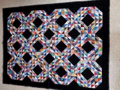 Hej Hanne Her kommer mit bidrag til et stof-restetæppe. Et slumretæppe til mig selv. Det færdige tæppe måler 140x185 cm. Tæppet er lavet af 1.152 trekanter, syet sammen to og to, så hver firkant måler 5x5 cm. Tæppet er syet i hånden (et dejligt projekt foran tv'et) og quiltet på maskine.