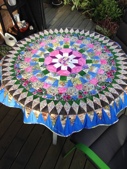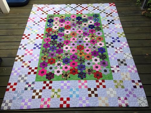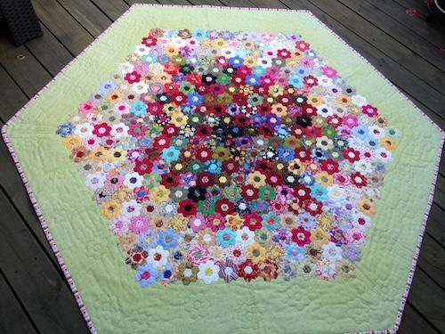 Der er 2 billeder af "Big Bang" tæppet, så man kan se, at det er sekskantet med masser af små blomster. Med venlig hilsen Signe