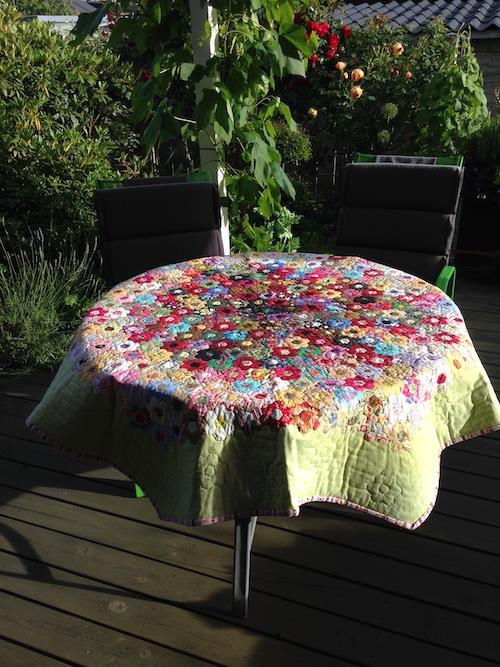 Det næsten kvadratiske tæppe er med større blomster i det grønne og en bred ternet kant.