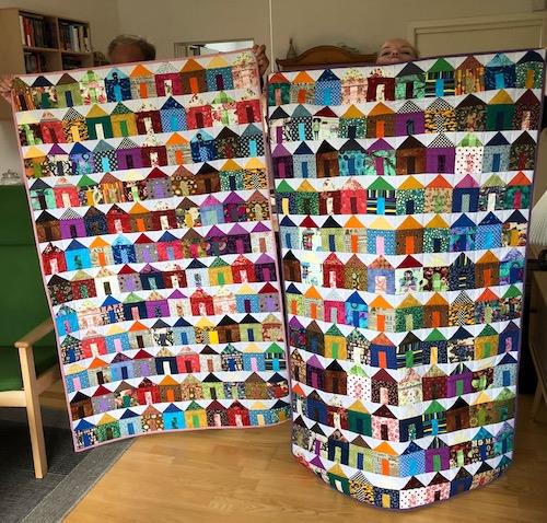 Det er 2 tæpper der er syet under corona nedlukningen - det blev min nevøs søde små piger der fik dem og de morer sig med at gætte hvem der bor i de forskellige huse - jeg mener de blev ca 1.20 x 1.40 - det er udelukkende syet af rester🤗Grete