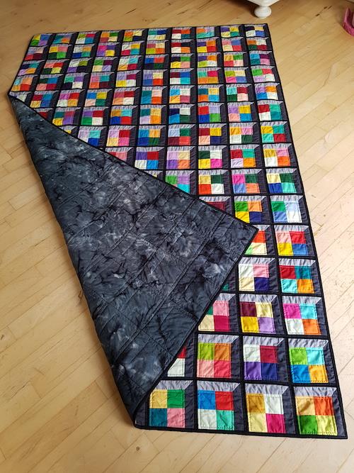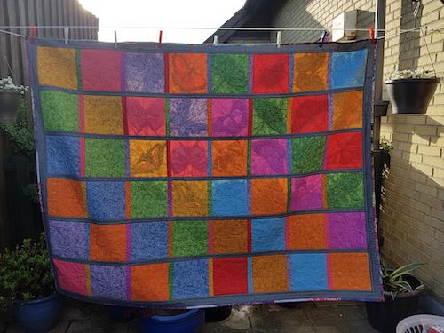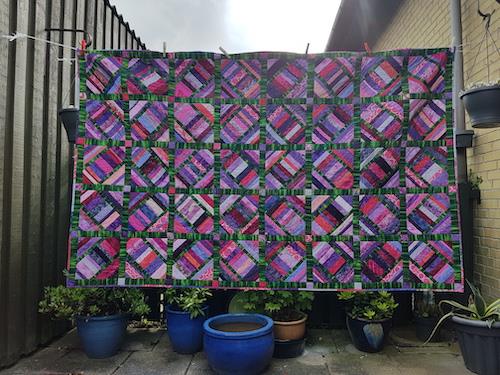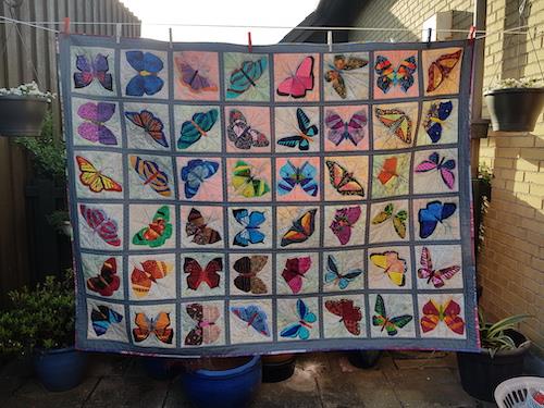 Et restetæppe med sommerfugle syet som paper piecing og quilt as you go.