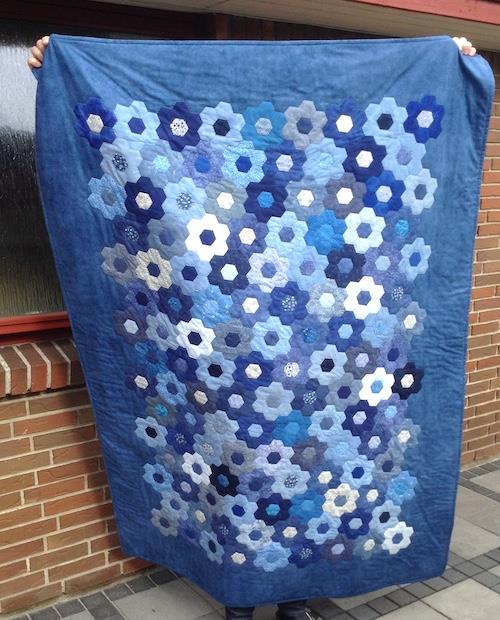 Her er mit bud på et restetæppe, syet af 40 års blå rester.