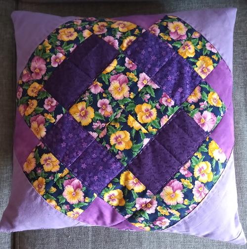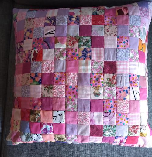 Hej Hanne,  Tillykke med de 18 år ! Sender et billede af en pude jeg har syet. Bagsiden består af mange, mange små 3x3 cm firkanter. De er syet over pap, og består af mange forskellige lyserøde stofrester samlet igennem mange år.    Vh Sølvi