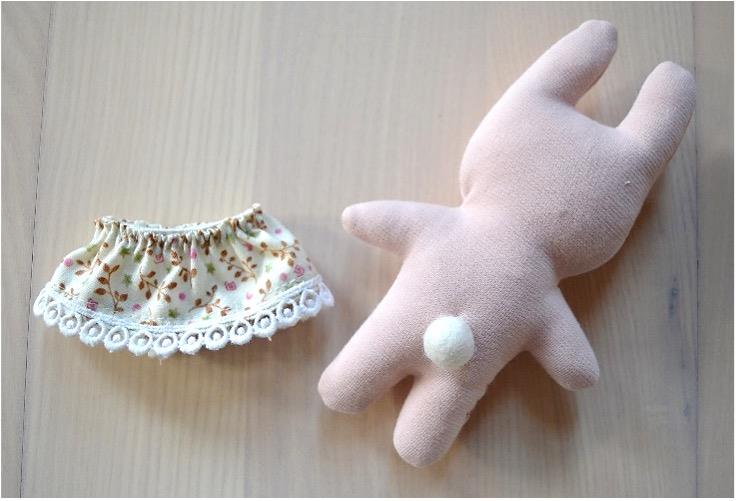Den lille LommeKanin har en nederdel og en sovepose, og det hele kan opbevares i en lille stofpose, der lukkes med snoretræk.