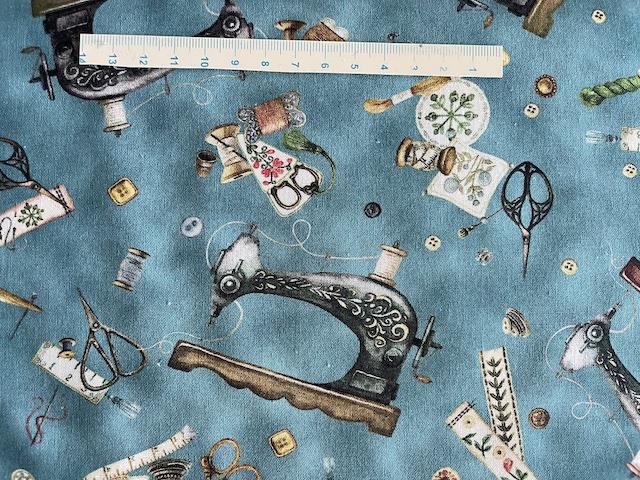 Dette meget flotte patchwork stof med blålig bundfarve og masser af symaskiner og tilbehør og broderi ting på i alle retninger