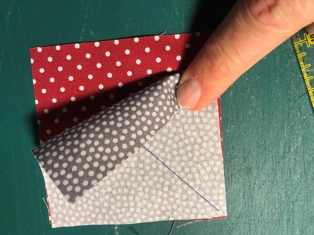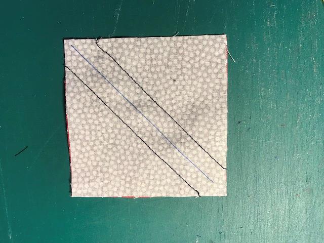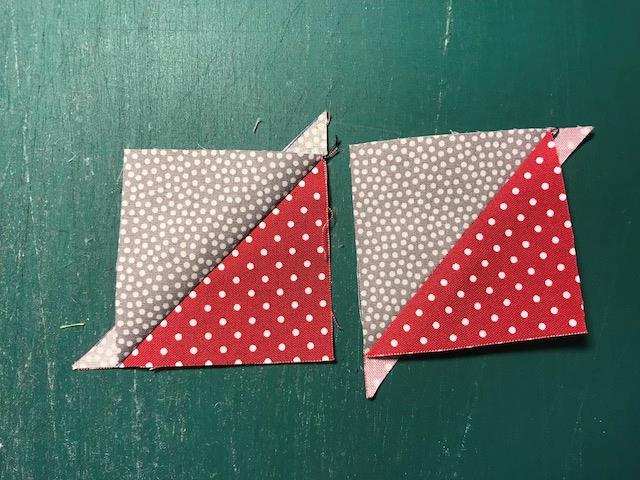 For hver 2 firkanter på 8 x 8 cm syet på denne måde, får du 2 firkanter, der hver består af to trekanter og måler 6.5 x 6,5 cm