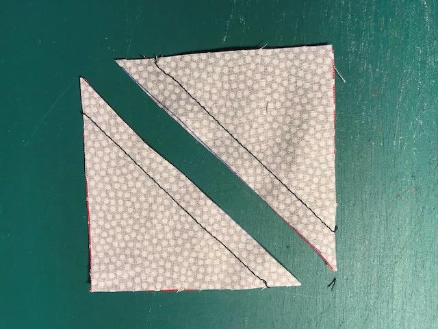 Trekanterne kan du skære ud med 0,75 cm sømrum og sy dem sammen 2 og 2 til en firkant.