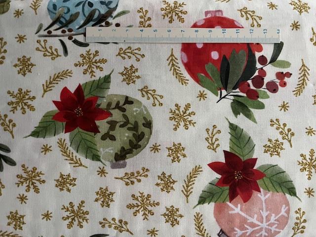 Er et flot lys bred bomuldsstof med flotte forskellige julekugler.