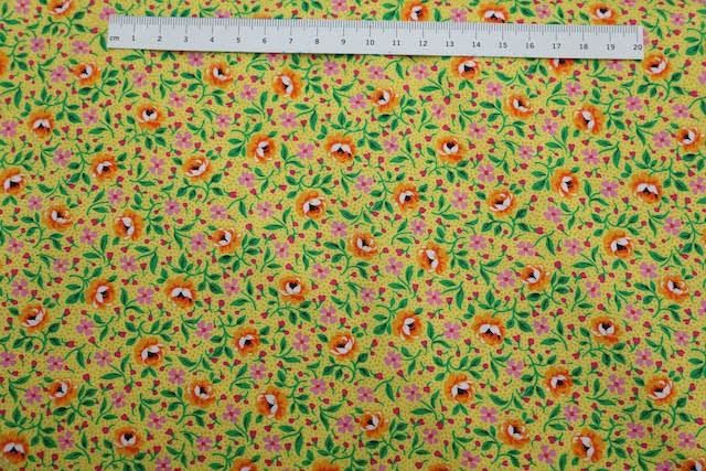 Er et smukt Gul orangepatchworkstof med små blomster og grønne blade.