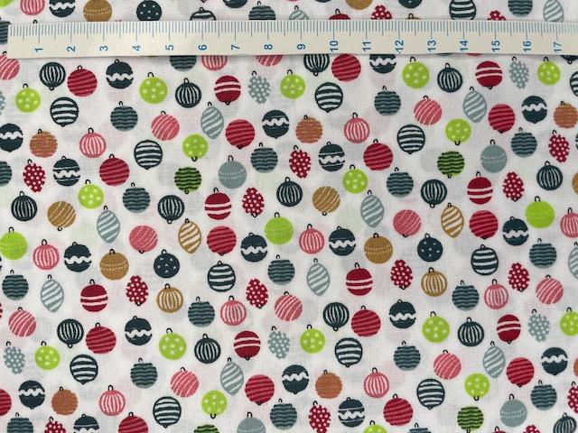 Er et flot hvid bred bomuldsstof med flotte forskellige farver jule julekugler.