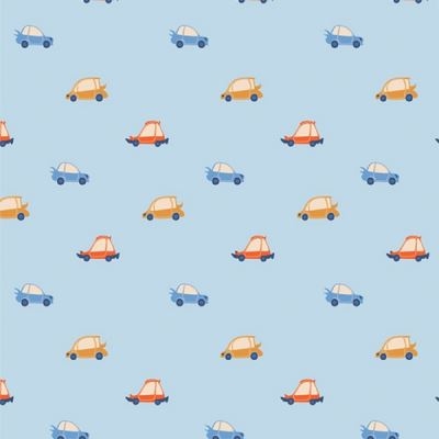 Det meget flotte patchwork stof med blå/grøn bundfarve og masser af søde små biler i mange farver
