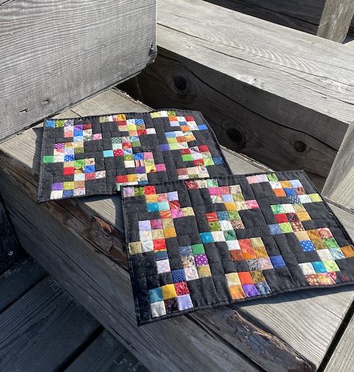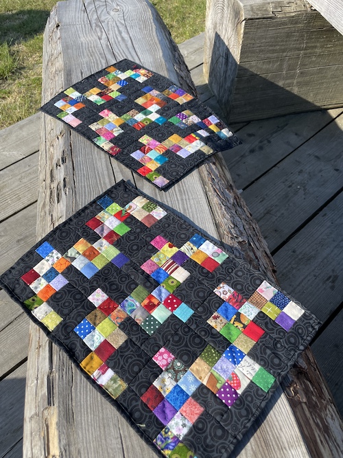 Og her med mini firkanter til 2 smukke håndsyet dækkeservietter.
