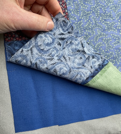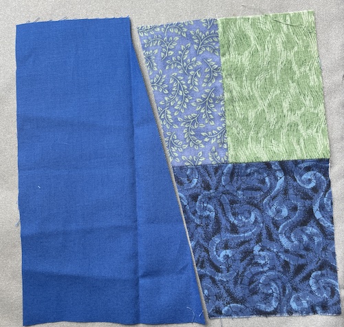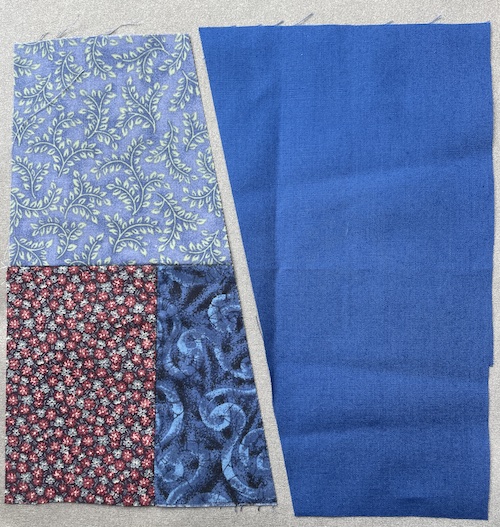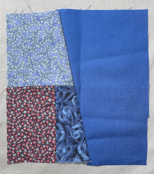 Når en blok bliver til et sæt grydelapper skal du bruge en færdig syet blok og en stykke stof ( her ensfarvet) i samme størrelse. Du behøver ikke at skære dem 100% ens.