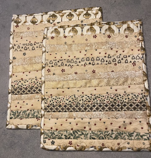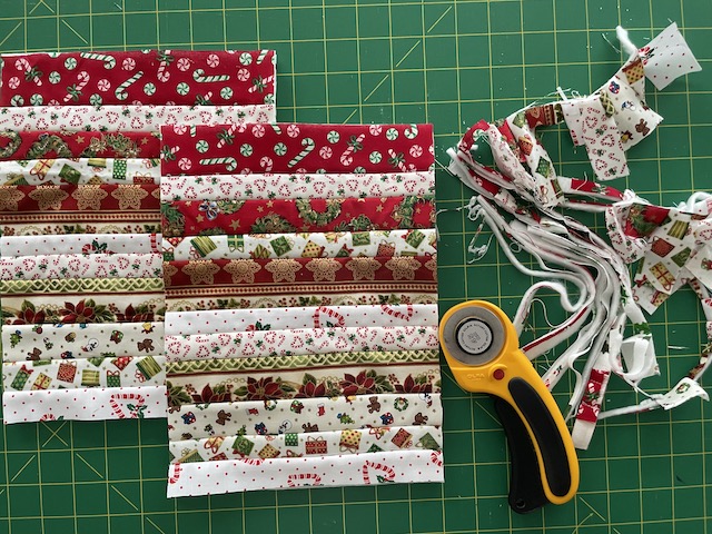 Ingen af mine strimler til disse nemme syet grydelapper har samme størrelse, ja jeg synes det giver et lidt sjovt spil i dem.