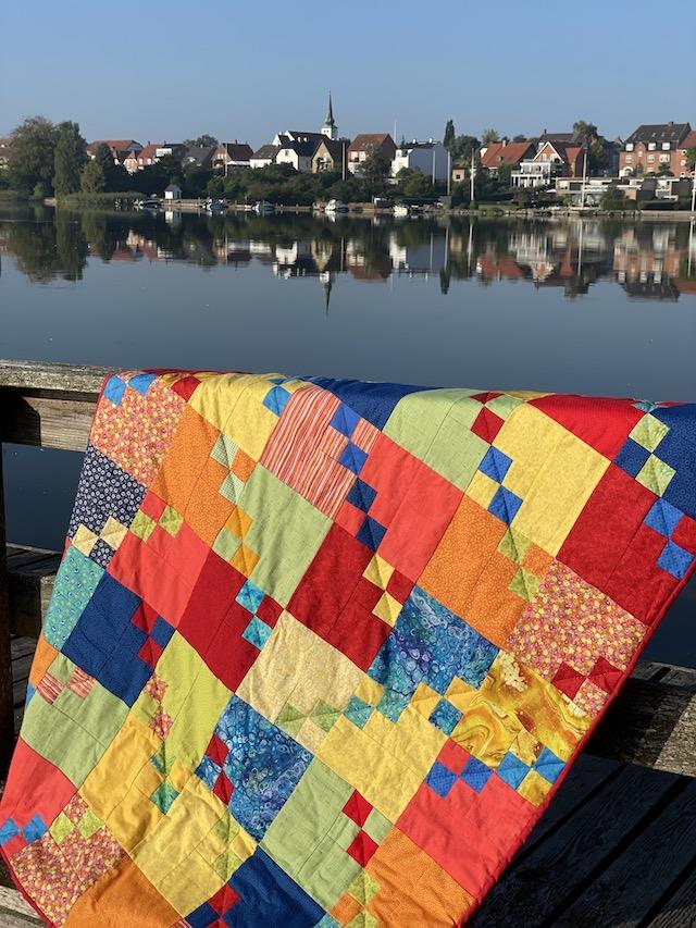 Forside » Gratis DIY og Inspiration » Patchworktæpper med danske bynavne 🇩🇰 » Restetæpper opdelt i de figure de er syet i » Restetæpper syet af 3 figurer » Nemt reste tæppe i kun firkanter - Esbjerg tæppet