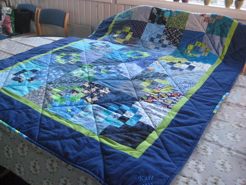 Jeg har quiltet igennem kontrast farven diagonalt på tæppet.
